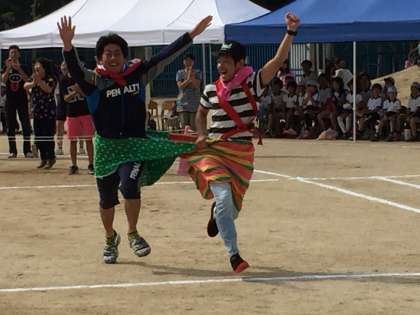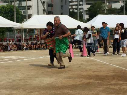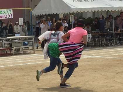 PTA、教職員によるデカパンリレー。みんな小学生にもどったようないい笑顔で走っていました。