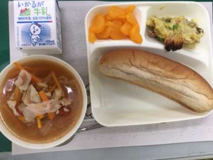 9月7日の給食は、豆乳マカロニグラタン、トマトスープ、みかんでした。トマトスープはキャベツやニンジン、セロリなど野菜がたっぷり入っていました。