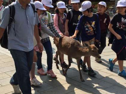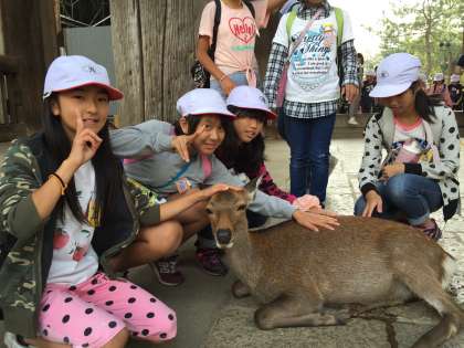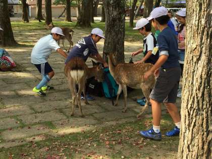 奈良公園は鹿とふれあうのも楽しみの一つです。鹿を撫でてみたり、いっしょに走ったりしました。