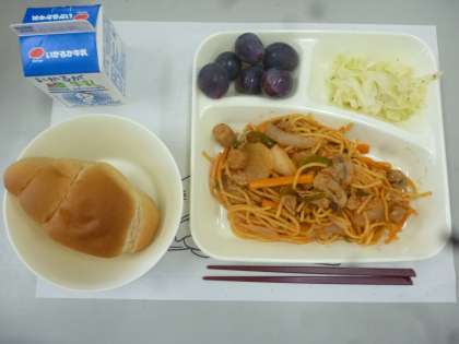 9月27日の給食は、イタリアンスパゲッティ、キャベツのバジル風味サラダ、ぶどう(巨峰)です。ぶどうには、そのまま食べるものやワインなどに加工されるものがあります。給食には巨峰という種類のものが出ています。甘くて大粒で、ジューシーです。