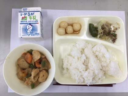 9月28日の給食は、一口がんもとさといものみそ煮、牛肉と野菜のいためもの、みたらしだんごです。これはお月見こんだてです。今年は9月29日が「中秋の名月」の日です。月見の日には、昔から、いもやだんごを食べます。