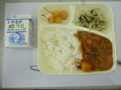10月3日の給食は、ハヤシライス[米粉]、キャベツのひじきドレッシング、さくらんぼです。給食で使うハヤシライスのルウは小麦粉の代わりに上新粉(米粉)を使っています。小麦アレルギーがある人も食べられます。そして、とってもおいしいです。