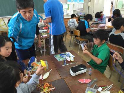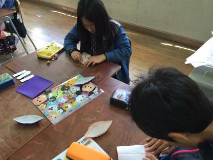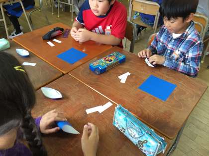5年生は、光ハイクでつかう道具を作っていました。教育実習生の田中先生に指導してもらいながら、一つひとつ丁寧に仕上げています。