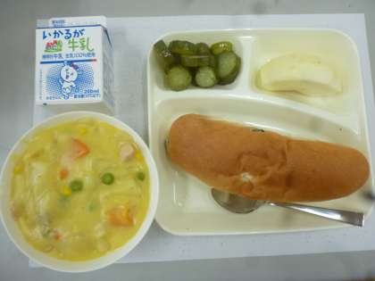 10月6日の給食は「豆乳コーンクリームシチュー」「きゅうりのバジル風味サラダ」でデザートにりんごがでました。りんごが出ることにより、秋になったことを感じます。