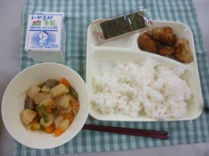 10月10日の給食は「みそカツ」「じゃがいもと野菜の煮物」「焼きのり」です。みそカツはサクッとした歯触りで、味噌の味がよくついていておいしくいただけました。