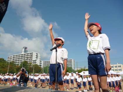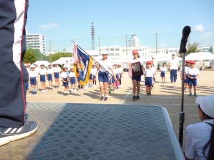 続いて校旗・児童会旗掲揚、優勝旗・準優勝盾返還、児童代表の言葉です。堂々とした態度でした。