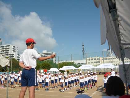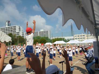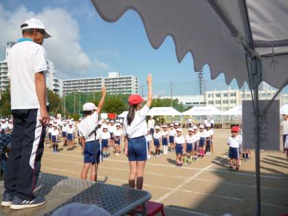 児童代表の言葉を受けて、全児童が運動会のめあてを大きな声で言いました。次に校歌を歌い、ラジオ体操をして体をほぐしました。