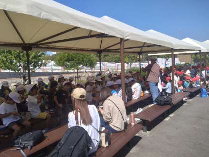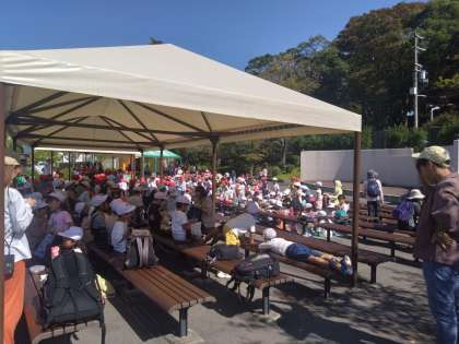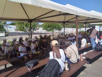 楽しいお昼ごはんです。たくさんの学校でいっぱいです。早く入れたので日陰のベンチの確保できました。これから午後の見学です。