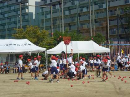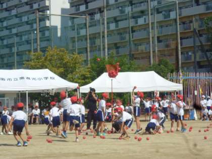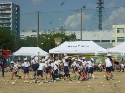 1年生・2年生の「Dancing 玉入れ」です。1回戦は2年生、2回戦は1年生、3回戦は両学年合同です。音楽に合わせて踊っている途中で音楽が止まると玉入れを始めるというメリハリのある競技に、保護者地域の方々もよい笑顔で見ておられました。