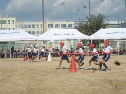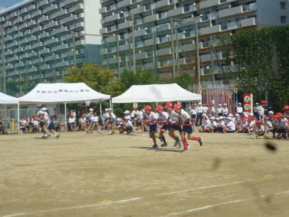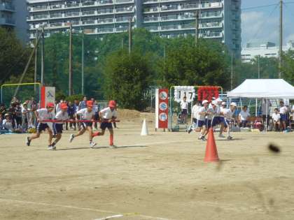 運動会最後の団体競技、3年生と4年生の「メイルストローム」です。棒を3〜4年で持って走り、コーンのところで回転します。うまく回転することが勝利につながりますが、なかなか難しそうでした。