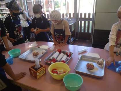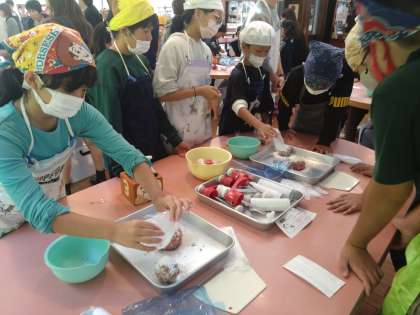 ウィンナー作りが始まりました。肉に調味料をかけます。