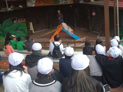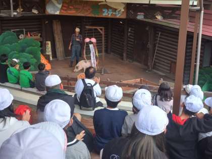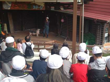 ミニブタ芸ステージの見学です。楽しいショーに拍手です。