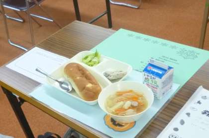 10月23日の給食は、「かつおのガーリックマリネ焼き[ノンエッグドレッシング]」「ウインナーとじゃがいものスープ」「キャベツのサラダ」です。キャベツはあっさり塩あじでとても食べやすかったです。今日は給食試食会で、保護者の皆様にも食べていただくことができました。