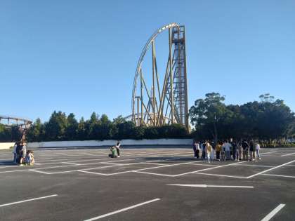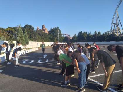 ジェットコースターの「ピレネー」をバックに朝の会とラジオ体操です。その後、記念撮影をしました。みんな元気いっぱいです。