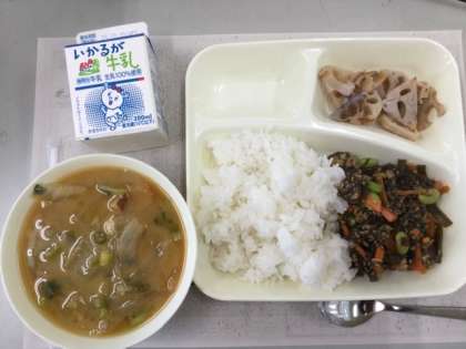 10月24日の給食は、「もずくと豚ひき肉のジューシー」「さつまいものみそ汁」「焼きれんこん」です。ジューシーは沖縄の料理で、給食では炊き込みご飯でした。とても美味しかったです。みそ汁にも秋の味覚のさつまいもがたくさん入っていました。