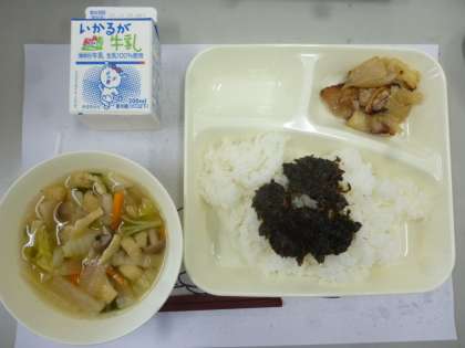 11月1日の給食は、「豚肉のスタミナ焼き」「すまし汁」「のりのつくだ煮」でした。肉料理と、すまし汁にたっぷり野菜が入っていて、栄養のバランスの取れた給食でした。のりのつくだ煮も、ご飯の共にピッタリの味付けでした。
