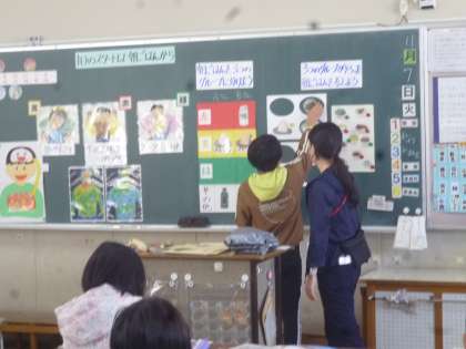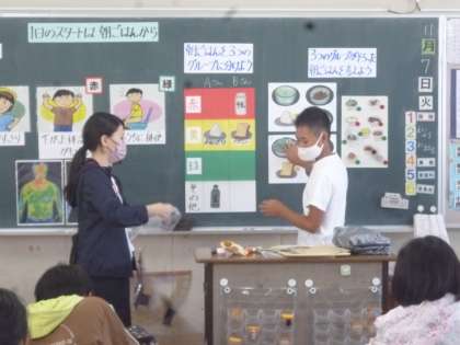 5年生は他校の栄養教諭の先生に栄養についての授業をしていただきました。テーマは「1日のスタートは朝ごはんから」で、朝食の大切さや栄養のバランスを考えることについて教えていただきました。栄養のバランスを考えて献立を選び、黒板で献立の絵を動かしていました。
