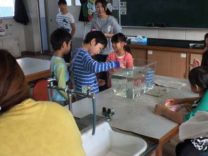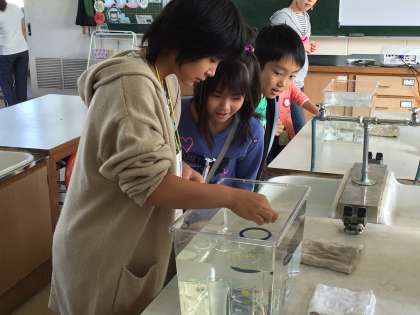水の中にコインを入れるとゆらゆらと落ちるうちに、ねらいから大きくはずれていく。コイン落し、なかなかうまくいきません。広報委員会によるゲームでした。