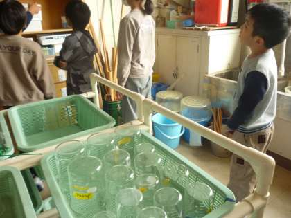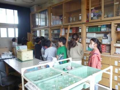 4年生は初めて理科室を使いました。教科書に載っている「理科室の使い方」を読んで、理科室での注意事項を確認しました。その後、理科準備室に入り、実験器具を見ていきました。