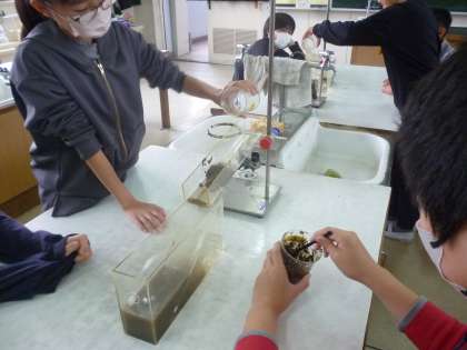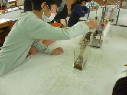 6年生は理科で、地層のでき方を調べる実験をしました。斜めにした装置に土を置き、ビーカーで水を注いで実験していきました。下部に粒の大きな土が、上部に細かい土がたまることを確かめていきました。