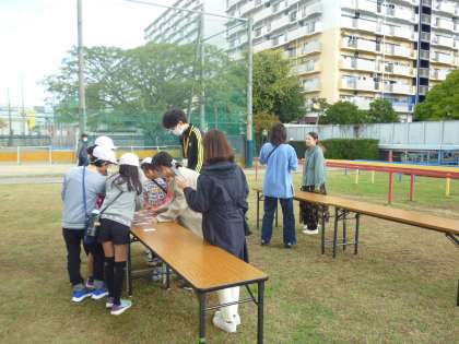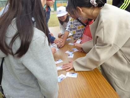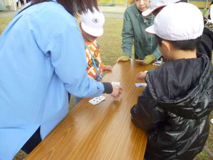 次からは学校内です。芝生広場での「PTA保健給食委員会」様の「タイムマッチング」です。カードをめくり同じ数字がそろうとカードが減っていくトランプの「神経衰弱」と同じルールです。決められた時間内で何枚そろうかで点数が決まります。カードの数字を覚えていこうと協力し合っていました。