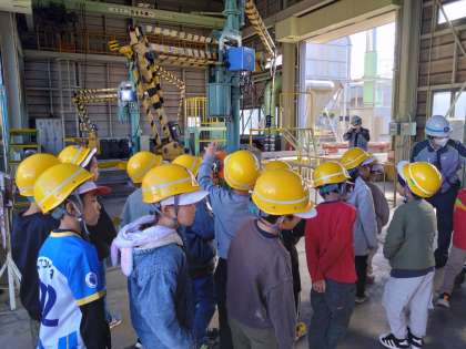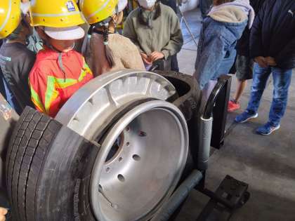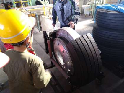 次はタイヤを交換する場所を見学しました。今日はタイヤの交換作業のない日でしたが、近くで交換機械を見る事ができました。
