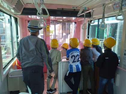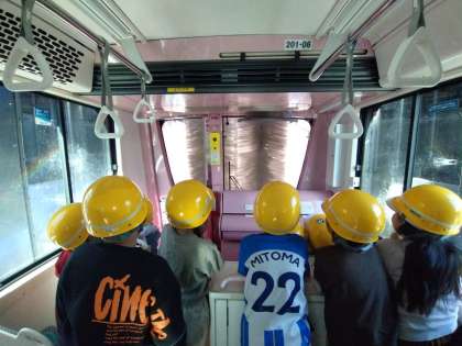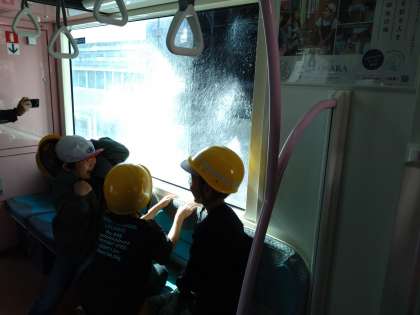 車両に乗せてもらい、洗車体験です。大きなブラシが回転し、その迫力にみんな大きな歓声をあげていました。多分、一番心に残った見学になったことだと思います。