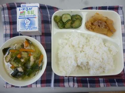 11月16日の給食は「豚肉のコチジャンいため」「鶏肉とはるさめのスープ」「きゅうりのナルム」です。韓国風味のおいしい献立でした。