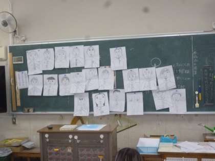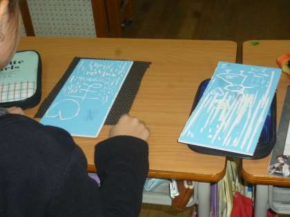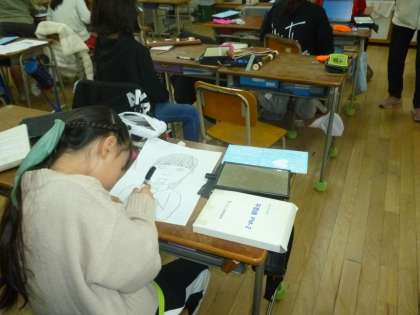 4年生は版画に取り組んでいます。下絵を書く前に、版画の板を彫る練習をし、今日は鉛筆で下絵を書きました。テーマは「リコーダーを吹く自分自身」です。鏡に映る体をよく見て下絵を書いていました。