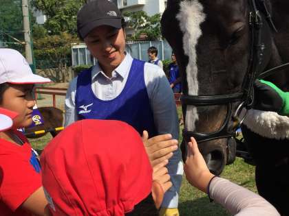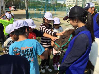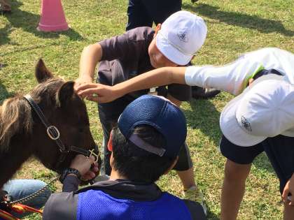 5年生は、サラブレッドや2頭のポニーに触らせてもらいました。馬はとてもおとなしく、子どもたちもこわがらずに、いろいろなところをなでていました。近くによると、競走馬の大きさを実感しました。