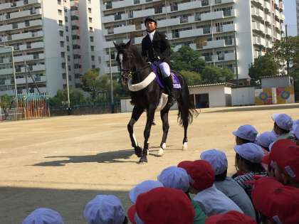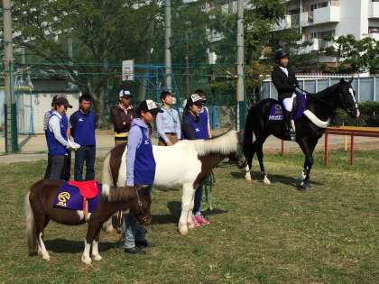 今日は、馬と親しむ体験学習を行いました。5年生が総合学習の時間のために、JRAの協力を得て実現しました。休み時間は、全学年の児童の前を、サラブレッドが駆け抜けました。その迫力に、みんなびっくりしていました。なお、この様子は朝日小学生新聞に掲載される予定です。記事が送られてきた時には、あらためて紹介いたします。