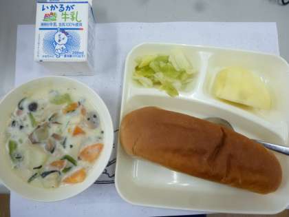 11月29日の給食は「きのこのクリームシチュー」「キャベツのピクルス」でデザートにリンゴがでました。11月の給食は柿、みかん、りんごのデザートがでました。給食も冬に向かっています。。