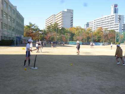 6年生は体育でTボールに取り組んでいます。6年生になると打球も速く、遠くまで飛ばす力があります。キャッチボールで体を慣らし、打者以外は守りについて、ボールを追いかけていました。