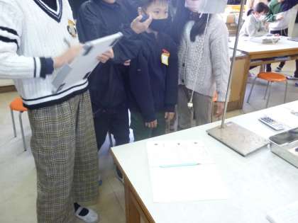 5年生は理科で振り子を使った実験をしました。今日は振り子の振れ幅を変えると、往復の時間はどうなるか」が課題です。ストップウォッチを操作する係、振り子を操作する係をグループで交代しながら進めていました。