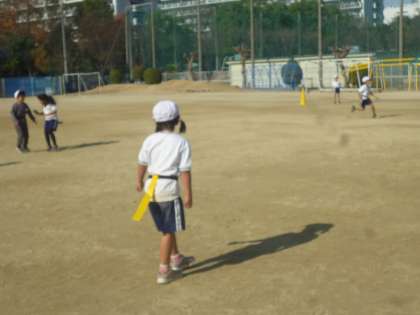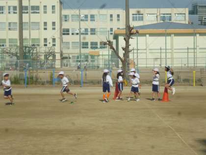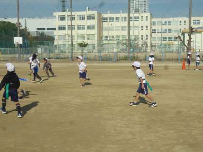 1年生は体育で「しっぽ取りゲーム」をしました。体操服のズボンの後ろにしっぽ上の布をたらし、そのしっぽを取り合うゲームです。楽しく取り組みながら体力を養うゲームです。