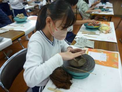 今日のクラフトパーク様の出前授業は5年生と6年生です。形や模様を工夫しながら仕上げていました。早く完成した子はミニ器を作るなど、楽しんで活動していました。