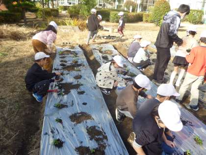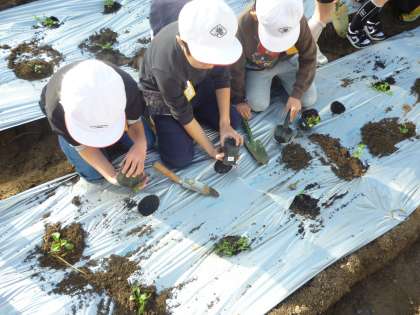 2年生はサニーレタスなどの野菜を植えました。ポットから野菜の苗を慎重に取り出し、ていねいに植えていきました。