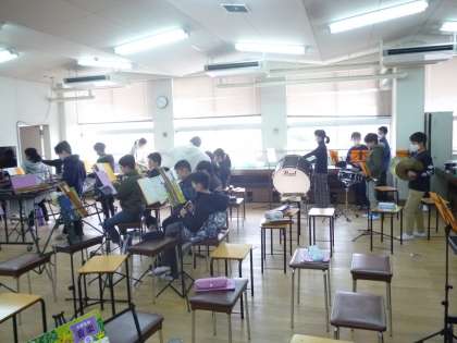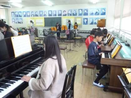 5年生は音楽で「虹」の合奏の練習をしています。自分のパートをしっかりと練習していました。