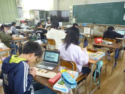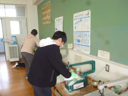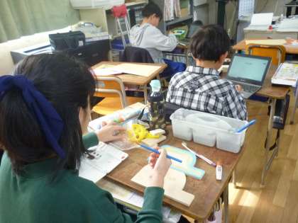 6年生は卒業制作で「テープカッター」を作っています。電動のこぎりで形を切ったり、着色をしたり、各自の手順で作成していました。