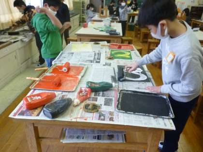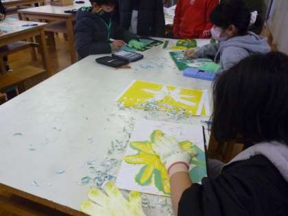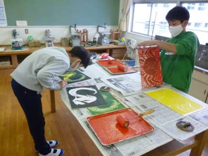 5年生はカラー刷りの板版画に取り組んでいます。彫りが終わった子からインクをつけて刷っていきました。どんどんきれいな版画ができていきました。