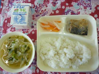 1月15日の給食は「さばのみそ煮」「すまし汁」「紅白なます」です。なますは酸味を抑えてあり、子どもたちが食べやすいように調理されていました。