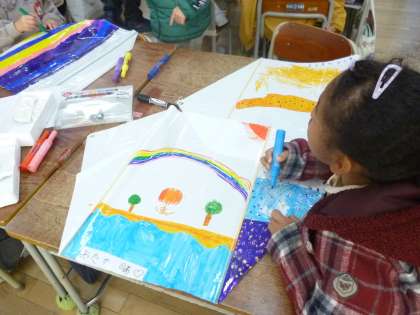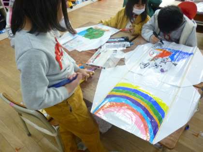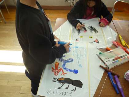 1年生は凧を作りました。ビニル製の凧にマジックペンで好きな絵を描いていき、楽しい凧ができました。天候を見て近々、運動場で凧あげをする予定です。