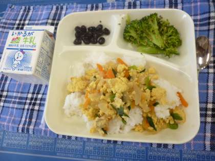 1月17日の給食は「親子丼」「ブロッコリーのごま和え」「黒豆の煮物」です。親子丼はアレルギー対応の個別対応献立です。