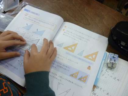 3年生は、「三角形と角」の学習で、三角定規を使って角度を測る学習をしています。2つの三角定規の6つ角の大きさ比べをしたり、教科書に合わせて考えたりしました。三角定規を上手に使って学習ができました。