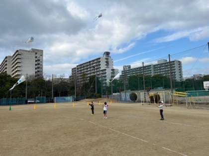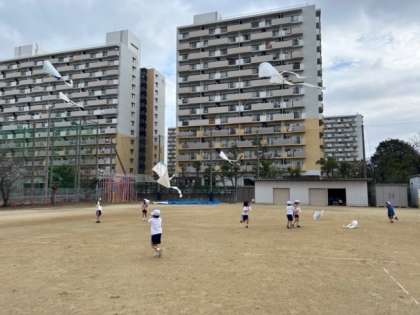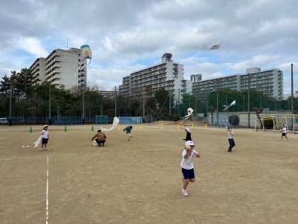 1年生は自分で作成した凧をあげました。友達の糸が絡まないように運動場いっぱいに広がり、元気よく走って凧をあげていました。今日は絶好の風があり、よくあがっていき、子どもたちは大喜びでした。