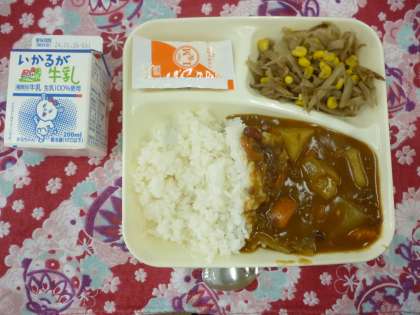 1月22日の給食は「牛肉と金時豆のカレーライス」「ごぼうサラダ」「固形チーズ」です。なお、今日1月22日は「カレーの日」とされています。