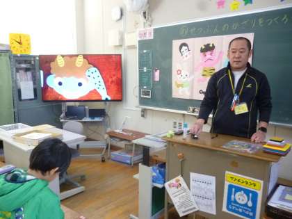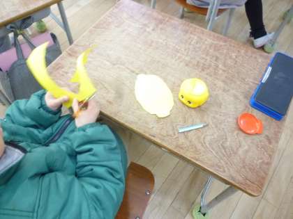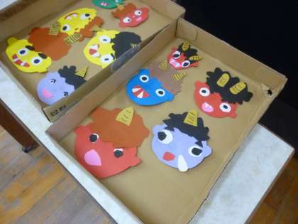1年生は節分の鬼づくりをしました。髪の毛の部分や角の部分、顔のパーツなどは思い思いに工夫して作りました。できあがった鬼は個性にあふれ、自分が作った鬼を満足そうにながめたり、友だちの鬼の工夫しているところを見つけたりできました。ハサミも上手に使っていました。
