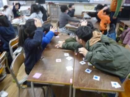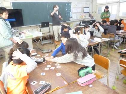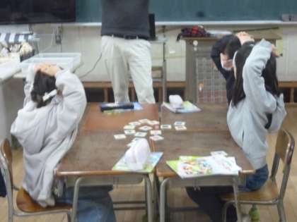 3年生の英語学習は「英語カルタ」をしました。先生が英語で「形」と「色」を言い、その合うカードを取ります。手を頭にのせてしっかりと英語を聞いていました。