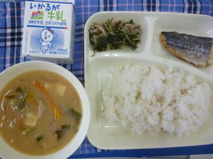 1月26日の給食は「さごしのしょうゆだれかけ」「豆腐のみそ汁」「みずなの煮びたし」です。和風献立でご飯が進みました。