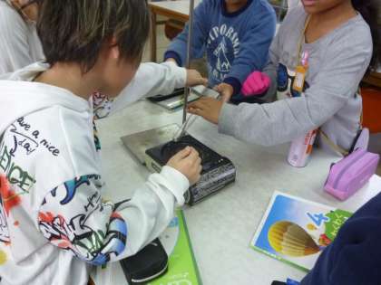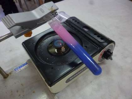 4年生は理科で「もののあたたまり方」を学習しています。示温インクの入った試験官を下からあたためたとき、上からあたためたときで、水のあたたまり方に違いがあることを実践しました。示温インクは、あたたまると青からピンクに色が変化するため、様子がよくわかり、実験を楽しみながら理解できていました。